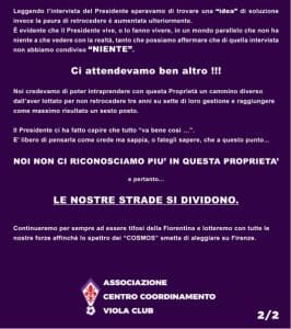 Si è visto un timido segnale da parte della Società – tutto da verificare – con le voci sull’incoronazione di Fabio Paratici a salvatore delle sorti della Fiorentina (ne parliamo nell’articolo a fianco in questo stesso numero) ma, a parte le perplessità sull’efficacia dell’operazione, rimangono per ora voci e illazioni, in attesa di una ufficialità che stenta ad arrivare.