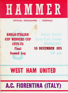 C’è un altro torneo di quegli anni, la Coppa di Lega Italo Inglese. È una partita secca tra chi ha vinto la Coppa Italia e la “seconda” coppa inglese, la Coppa di Lega. Partite di andata e ritorno. I viola partecipano in quanto detentori della Coppa Italia e incontrano i londinesi del West Ham che si sono aggiudicati la Coppa di Lega.